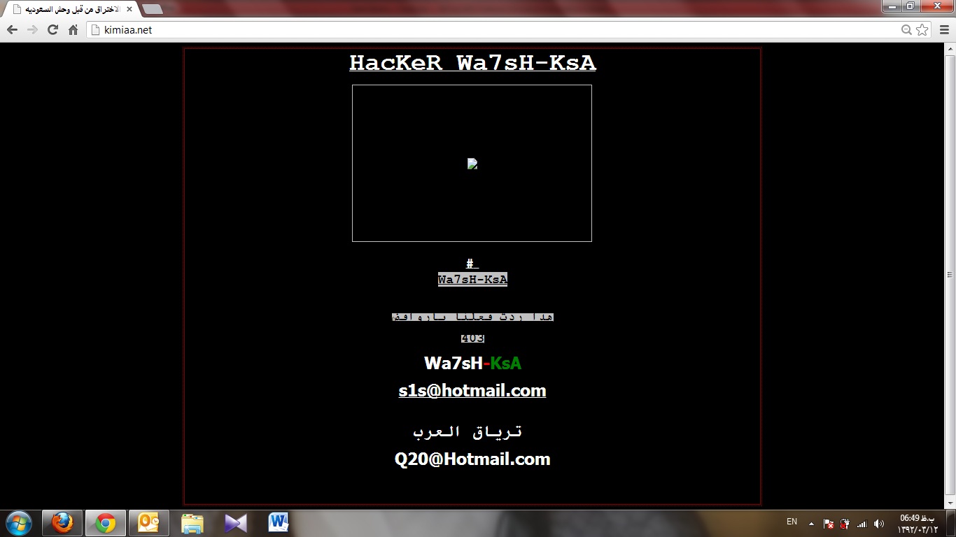 دفعهی پیش اگر یادتان باشد یک عکس برایمان گذاشته بودند و گفته بودند وضع امنیت سایت شما خیلی ضعیف است و غیره؛ اما این دفعه انگار طرف، از عربستان سعودی هکمان کرده است آن هم به جرم شیعهبودنمان؛ چون در صغحهای که به جای کیمیا بارگذاری کرده نوشته: «این کاری است که ما با رافضیها میکنیم».